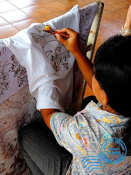 途中我們拜訪了蠟染村,蠟染的技術在中國、東南亞一帶頗是盛行,也是巴里島的傳統技藝,利用液態蠟於布上畫出圖案,之後再染色完成。雖說是蠟染村,但其實比較像個工坊,遊客可以根據自己的喜好由師傅們幫你完成圖案,但因染色需更多時間與工序,所以大多只簡單繪圖。村內有販售完成的蠟染作品,有需要的朋友倒可以細細挑選。
