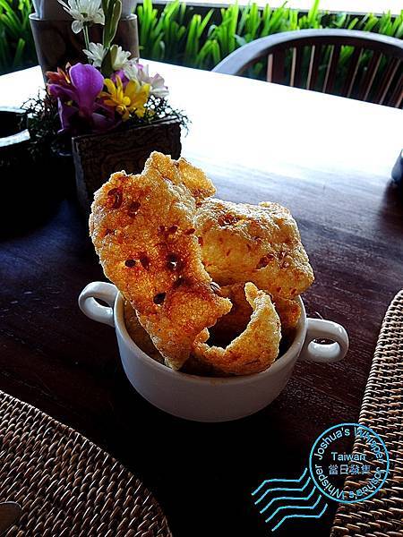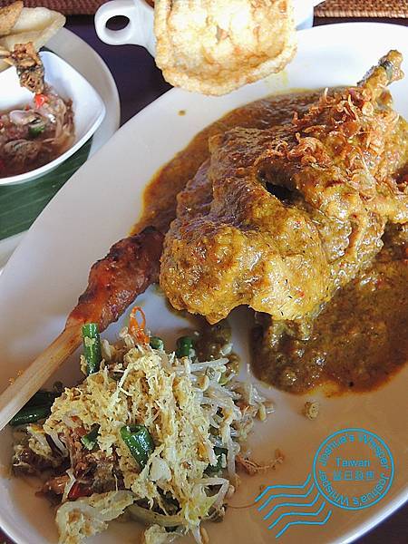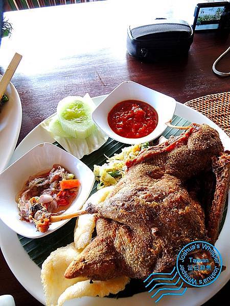 小弟拜訪的這家剛好被田園包圍,入座後原本期待是否會看到鴨群漫步,但卻不如人意。餐廳人潮不少,點了道油炸鴨,搭配上巴里島傳統佐料與白飯,頗為不錯。一邊細細品味、偶而抬頭看看餐廳布置與一旁田園風景,亦是一種享受。