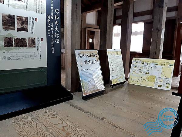 再上一層,除了一些照片與說明就純欣賞原始天守的建築之美,有點可惜,從這也可望見天守閣後方的二重櫓。花了不少時間本丸裡欣賞現存天守與二重櫓的日本城池建築之美,雖然想到之後下山還得走上一段山路頗為困擾,但這知名的山城的確值得一訪啊!