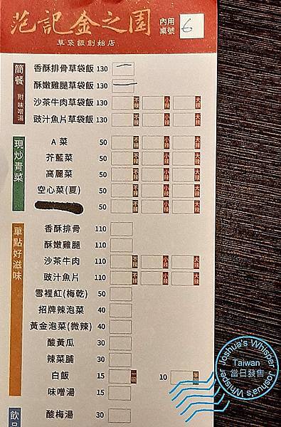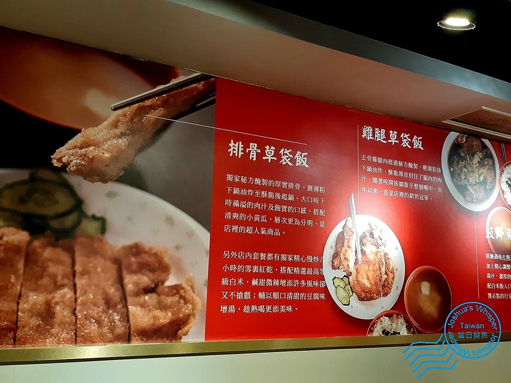 主餐(簡餐)就簡單四種:排骨草袋飯、雞腿草袋飯、沙茶牛肉草袋飯跟豉汁魚片草袋飯,加上其他單點品。初來乍到,便以主打排骨草袋飯與雞腿草袋飯為嚐試主角。