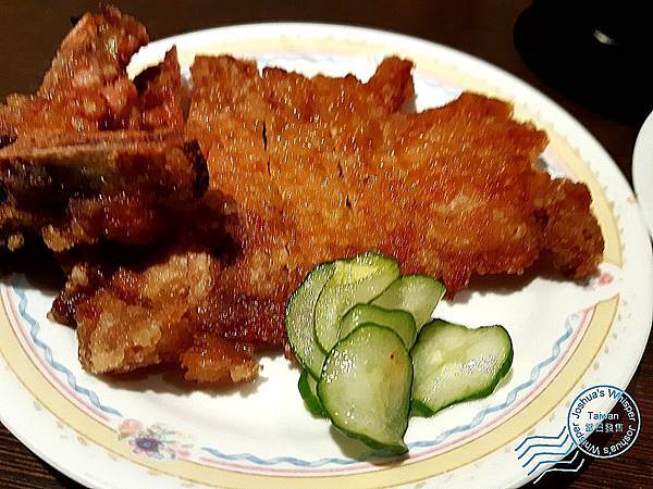 主角之一排骨草袋飯上場,獨家醃製的排骨搭配小黃瓜、濃郁的味增湯與佐以炒雪裡紅的白飯為一套餐。酥脆的排骨,厚實的口感,小黃瓜可略為調劑炸物的油膩感。主打的草袋飯入口有一股特別的味道在鼻腔處久久不去,確實不同。