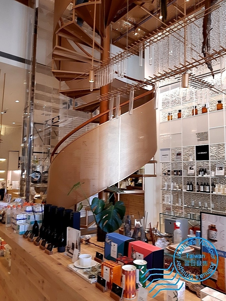 藥局中間那古銅色的旋轉樓梯巨大又吸睛,引領著訪客探索藥局二樓的陳設。