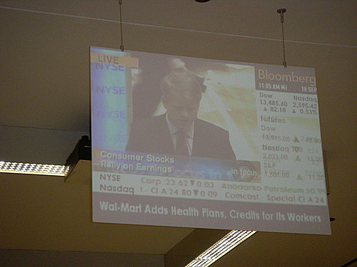 選擇權交易所內到處都有像這樣的投影電視,隨時撥放著最新的金融訊息。