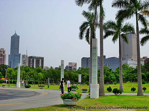 從中央公園裡,也可以觀賞到許多高雄市的地標建築,左邊為 85層大樓,右邊是漢神百貨大樓。